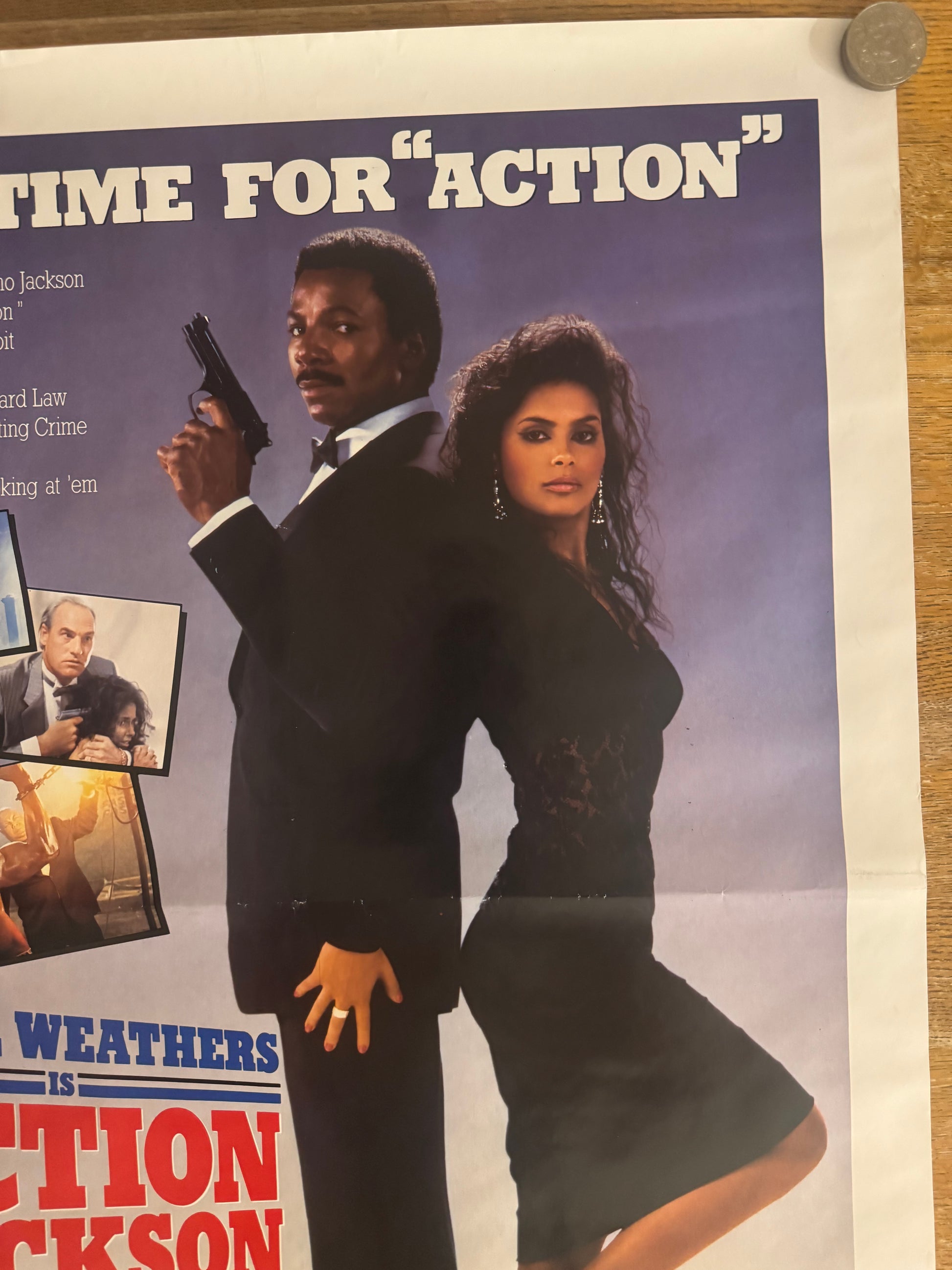 Discover this original Action Jackson (1988) UK video poster featuring Carl Weathers as the tough, no-nonsense Detroit cop Jericho "Action" Jackson. This rare UK home video release artwork captures the explosive action and 80s style of the cult classic film. A must-have collectible for fans of retro action movies, VHS memorabilia, and vintage movie posters.