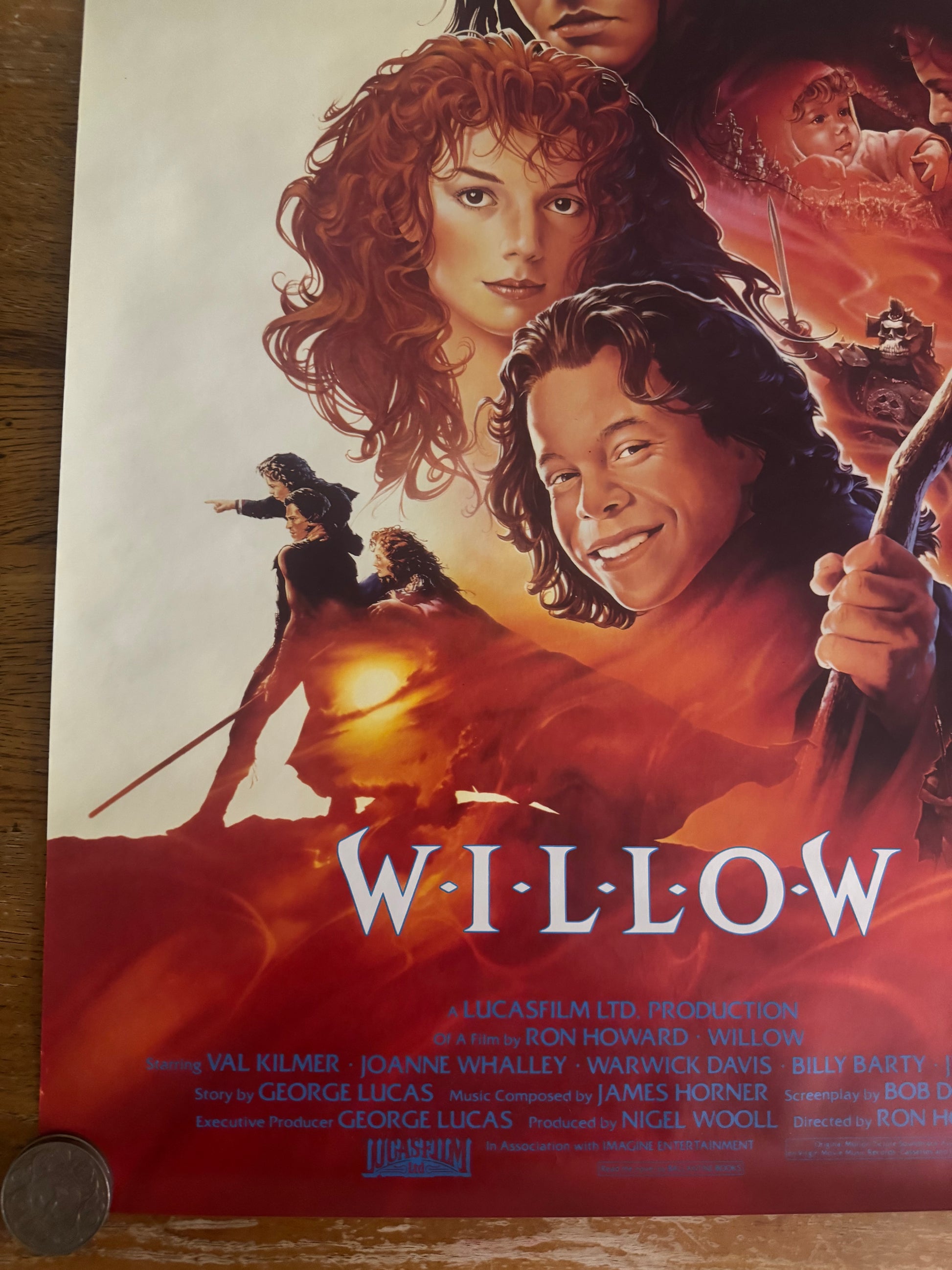 Discover the rare 1988 UK video release poster for Willow, the iconic fantasy adventure film directed by Ron Howard and produced by George Lucas. Featuring striking artwork unique to the UK home video market, this collectible poster showcases key characters like Willow Ufgood (Warwick Davis) and Madmartigan (Val Kilmer). A must-have for fans of 80s fantasy films and vintage movie memorabilia.